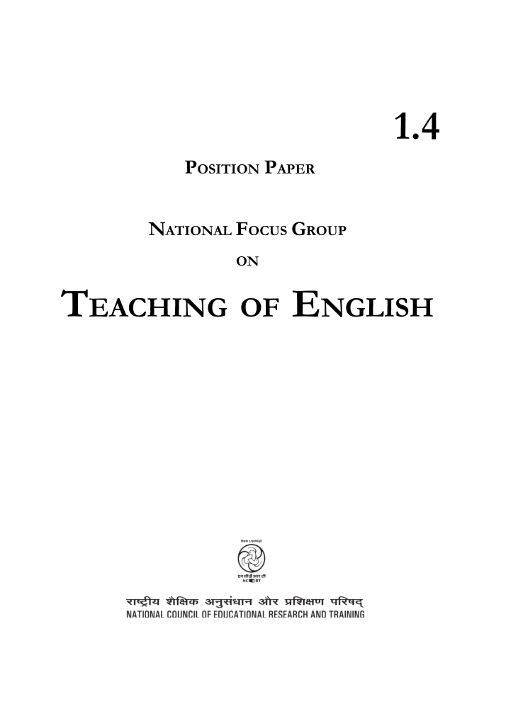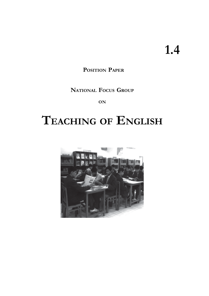 POSITION PAPER NATIONAL FOCUS GROUP ON TEACHING OF ENGLISH 1.4 POSITION PAPER NATIONAL FOCUS GROUP ON TEACHING OF ENGLISH 1.4 First Edition Mach 2006 Chaitra 1928 PD 5T BS © National Council of Educational Research and Training, 2006 Rs. 15.00 Printed on 80 GSM paper with NCERT watermark Published at the Publication Department by the Secretary, National Council of Educational Research and Training, Sri Aurobindo Marg, New Delhi 110 016 and printed at Bengal Offset Works, 335, Khajoor Road, Karol Bagh, New Delhi 110 005 ALL RIGHTS RESERVED /boxshadowdwnNo part of this publication may be reproduced, stored in a retrieval system or transmitted, in any form or by any means, electronic, mechanical, photocopying, recording or otherwise without the prior permission...