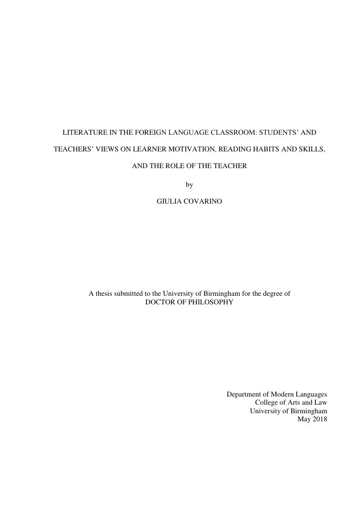 LITERATURE IN THE FOREIGN LANGUAGE CLASSROOM: STUDENTS’ AND TEACHERS’ VIEWS ON LEARNER MOTIVATION, READING HABITS AND SKILLS, AND THE ROLE OF THE TEACHER