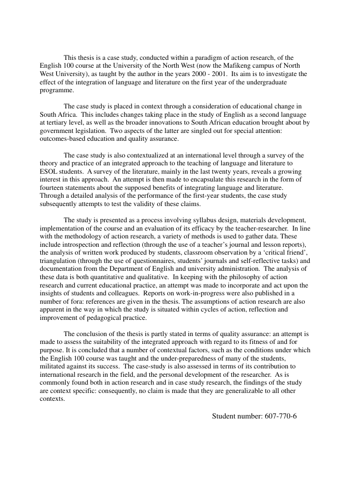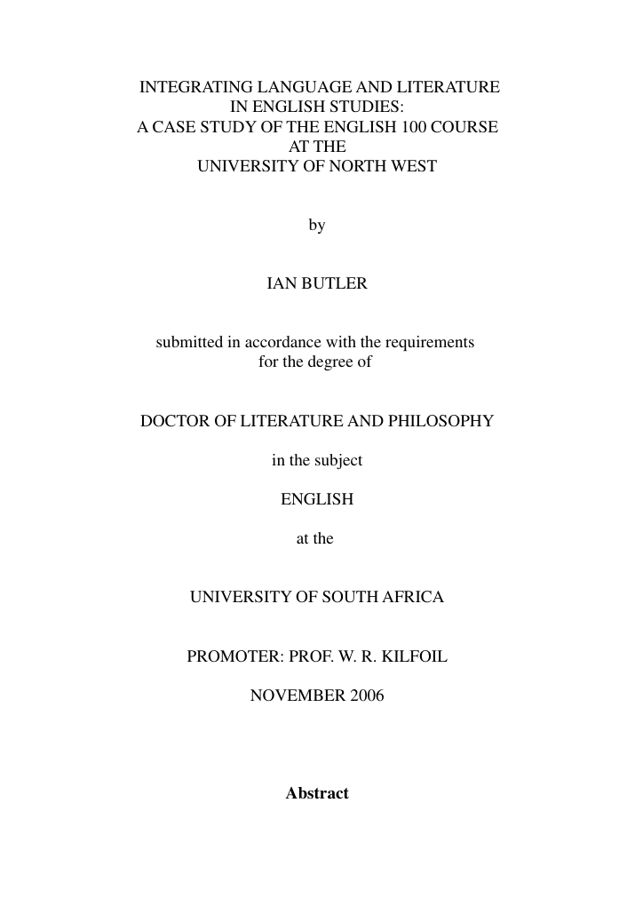INTEGRATING LANGUAGE AND LITERATURE IN ENGLISH STUDIES: A CASE STUDY OF THE ENGLISH 100 COURSE AT THE UNIVERSITY OF NORTH WEST